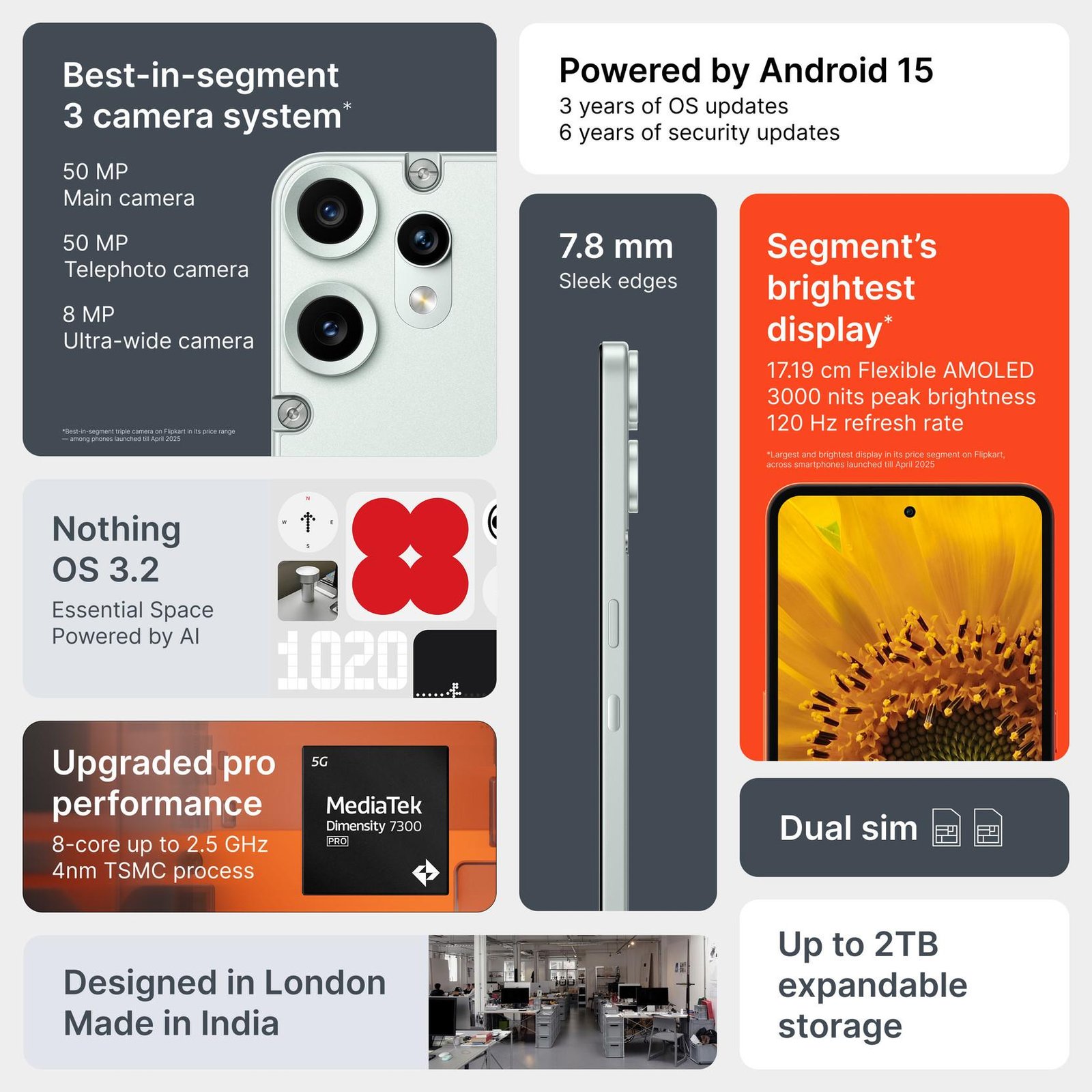 | 1. Powerful 5G Performance | MediaTek Dimensity 7300 Pro processor with Android 15 (Nothing OS 3) for smooth multitasking and lag-free gaming. |